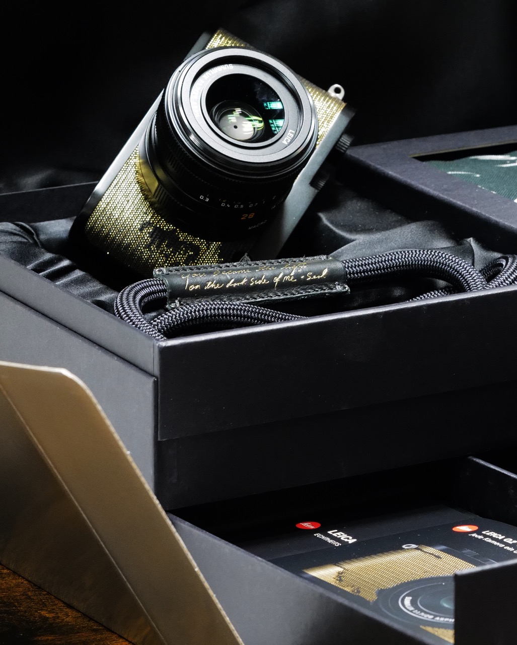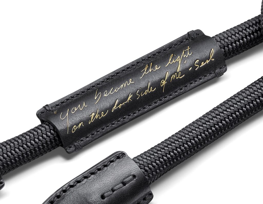 En. The Leica ‘Dawn’ by Seal is a limited edition of 500 pieces. Each case is unique in its iridescent coating made with a Japanese fabric from the house of Hosoo, composed of black thread and gold (washi) paper from traditional kimono, which makes shapes appear reminiscent of scars to the touch. The red tag has been replaced by a black tag with the Leica logo. Rope strap with special leather addition with a phrase taken from a song by Seal. Edition number and signature of Seal discreetly engraved under the glass of the back screen. The other features are identical to the black version of the standard camera (Leica Q2).
